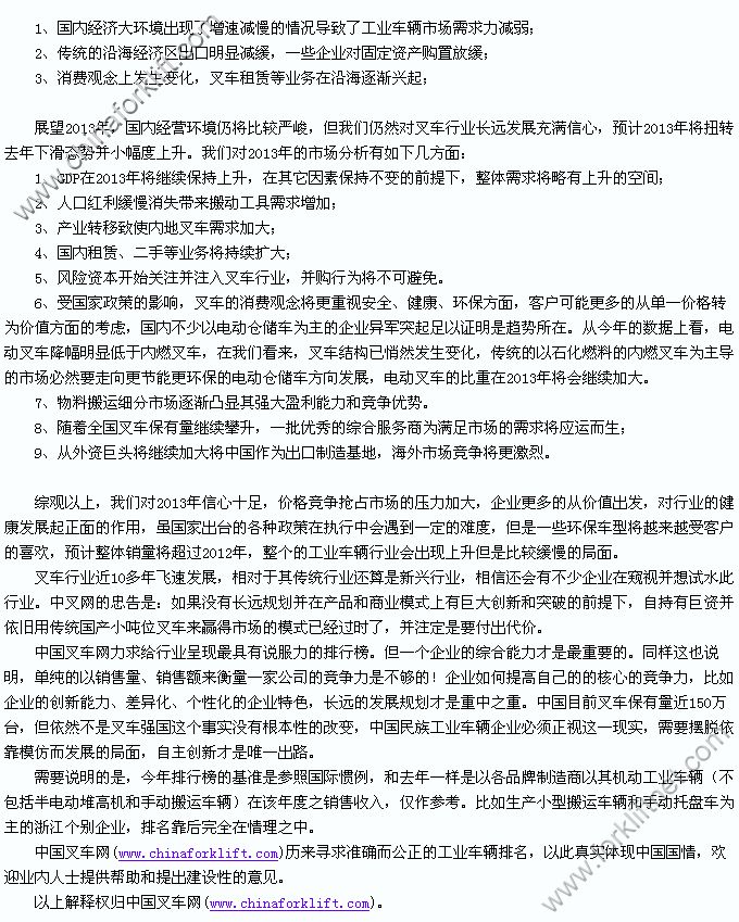 中叉网:2012年中国前40名叉车制造商排行榜