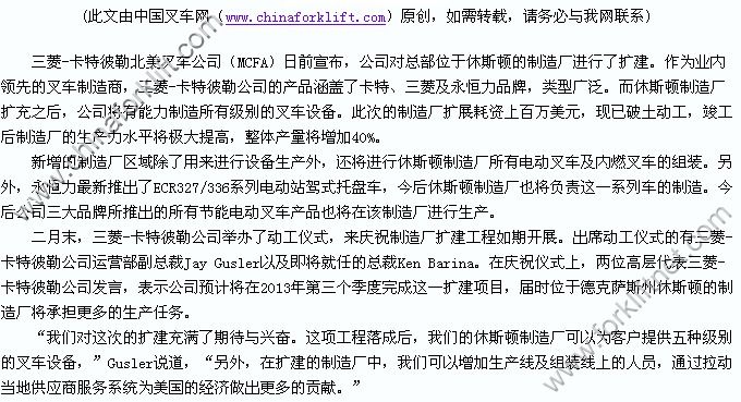 三菱重工和三菱卡特彼勒叉车(美洲、欧洲、亚洲),是全球最主要的叉车厂商之一,拥有数十年的叉车制造经验以及遍及世界的销售服务体系,以5万台/年以上的产量和傲视同业的卓越技术引领物流标准数十年。20年来孜孜不倦致力于支持中国叉车制造业的发展,更使之成为中国用户可信赖的合作者。在此基础上为贴近中国市场,为中国用户提供快捷高效的服务,于2004年3月24日成立菱重叉车(上海)有限公司。