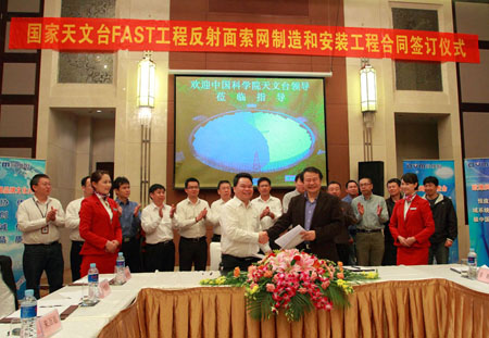 2013年3月30日,柳工欧维姆公司与中科院国家天文台关于FAST工程项目反射面索网制造和安装工程标的为1.185亿元合同签约仪式在柳州举行。国家天文台台长严俊、副台长郑晓年、总工程师南仁东,柳工集团公司副总裁、欧维姆公司董事长郑津,欧维姆公司党委书记刘广德、总经理刘璇等领导出席了签字仪式。