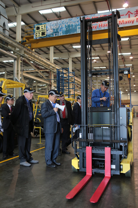 带着浓厚的兴趣,一行人员分成两组分别在海斯特营运经理、售后及采购总监、销售总监的带领下,进入厂区进行实地的参观和了解。在工厂参观的环节,会员们时不时停下来对生产线、配件仓库、装配过程,以及DFT技术等驻足停留,和讲解人员进行更深入的交流和探讨。而紧随其后的一场特别为他们准备的海斯特系列叉车的展示,更加让在场的所有成员印象深刻,其中更有对叉车颇感兴趣的人员亲自驾驶海斯特三向叉车,将驾驶室升到高空体验了一把世界顶级技术与配置相结合的仓储叉车所带给他的震撼魅力。叉车展示环节更加让大家感受到海斯特全系列叉车在任何繁重恶劣工况下,均能驾驭自如的强悍特质。