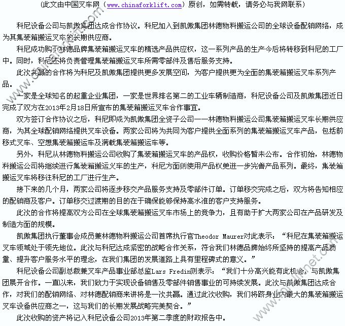 凯傲集团——拥有六大品牌:林德(Linde)、施蒂尔(STILL)、芬威克(Fenwick)、欧模-施蒂尔(OM STILL)、宝骊(Baoli)和沃尔塔斯(Voltas)——是欧洲工业叉车市场的领导者,是全球第二大工业叉车制造商,也是在中国占据领先地位的跨国供应商。林德和施蒂尔这两个品牌服务全球高端市场。芬威克是法国最大的物料搬运产品供应品牌,而欧模-施蒂尔是意大利市场上的佼佼者。宝骊品牌主打经济型市场,沃塔斯则是印度最顶尖的两家市场领导品牌之一。凯傲集团 2012 年的员工数为21000人,经营收入为47.3亿欧元。