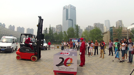 叉车叠香槟塔和倒酒进行互动表演