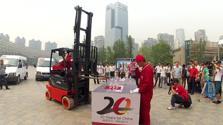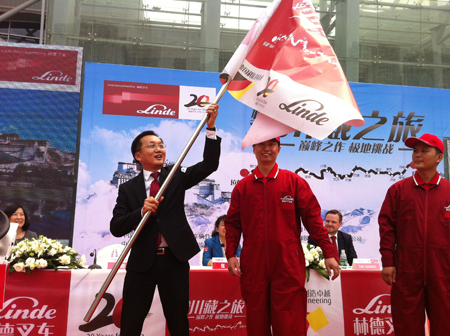 发车仪式上,此次川藏之旅主角-内燃平衡重式产品HT30作了精彩表演,并和林德另一系列的电动平衡重式叉车E16C配合叠香槟塔和倒酒进行互动,赢得了与会观众的阵阵掌声。林德(中国)内燃叉车HT30将成为叉车届第一辆雪域天路征服者,该系列叉车配备高品质大功率进口的发动机及高效传动系统,在拥有强劲动力的同时,仍可达到欧IIIA排放标准,卓越的性能和可靠的品质保证能够很好地适应沿线的恶劣气候与复杂的地质地理条件。林德(中国)拥有全系列的平衡重及仓储等叉车,提供最优化的物料搬运综合解决方案,为推进西部大开发和绿色物流行业发展贡献力量。