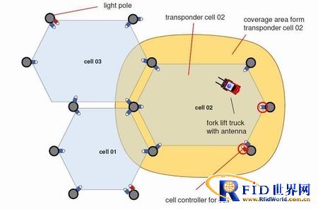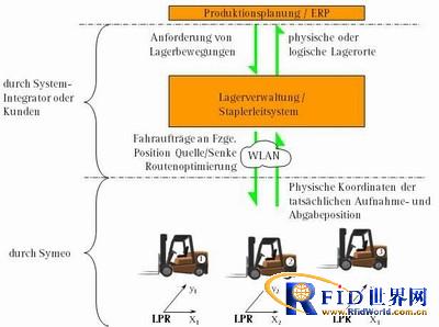 在仓库环境内安装若干个Symeo LPR_2D信号发射器,叉车上面安装Symeo LPR_2D定位终端装置,就可以实现2D定位。在叉车上安装一个基站和两个天线就能确定叉车的2D位置和航向角。信号发设备可以无限级联扩展覆盖面积,定位终端装置可以根据环境安装不同特性的接收天线提高定位精度和稳定性。再结合唐恩科技RFID货物识别系统和仓储管理系统,为实现仓储物流提供最佳解决方案。