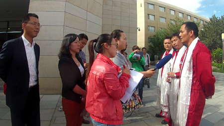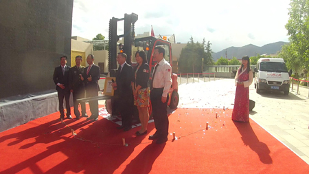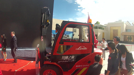 三位叉车手接受媒体采访嘉宾一起和获得证书的林德HT30叉车合影留念在HT30叉车上签名留念