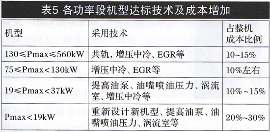 刘顺利:在济南汽车检测中心台架试验,选择一批能够满足国Ⅲ标准要求的机型和具备满足国Ⅲ标准潜力的机型进行了试验,排放控制技术是可行的,成本增加见表5。其中:对于130≤Pmax≤560kW的发动机,要满足该标准的排放限值要求,需要采用共轨、单体泵等车用机Ⅲ阶段的技术,传统的增压或增压中冷技术,已经不能满足本标准要求。这类机型主要由车用发动机的企业提供,企业已经具有相对成熟的排放控制技术,技术不存在问题,对达到该标准的要求没有技术难度。压燃式发动机成本增加2000〜5000元/台,约占总成本的10%〜15%左右。