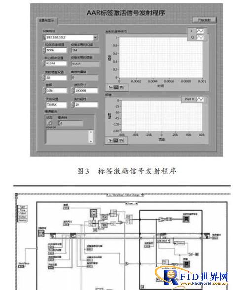 根据RFID系统的工作原理及AAR S-918标准中对工作的频率的规定,首先使用LabVIEW 软件编写发射激励波的程序,设置载波频率为915 MHz,采样率为800 kHz,发射增益为30 dB.程序前面板与系统框图分别如图3,图4所示.