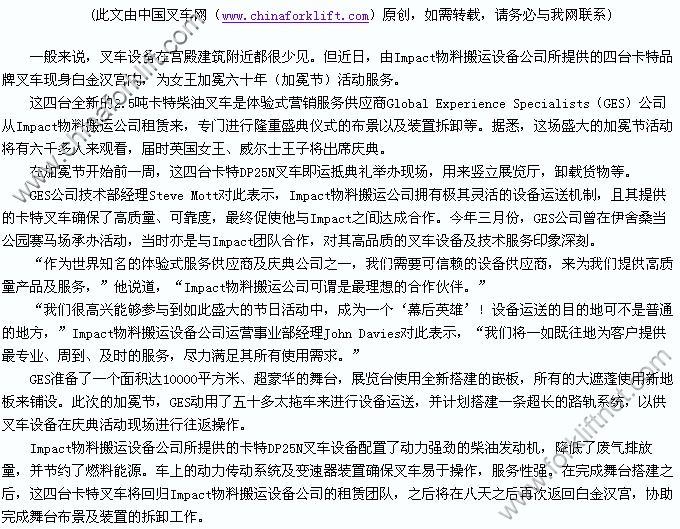 免责声明:中叉网(www.chinaforklift.com)尊重合法版权,反对侵权盗版。(凡是我网所转载之文章,文中所有文字内容和图片视频之知识产权均系原作者和机构所有。文章内容观点,与本网无关。如有需要删除,敬请来电商榷!)