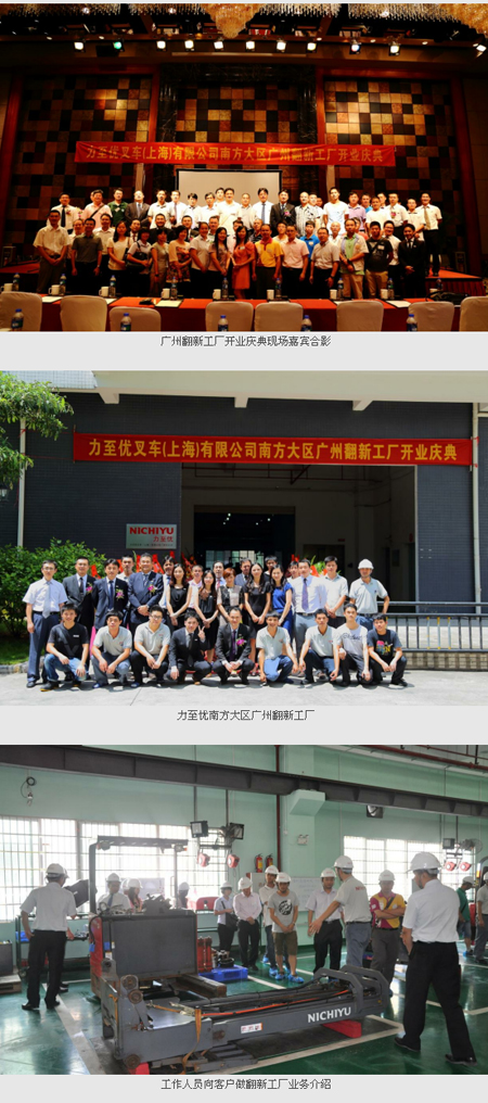 2013年8月8日力至优叉车(上海)有限公司南方大区广州翻新工厂在广州科学城举行了盛大的开业典礼, 这是力至优中国大区第三个正式开业的翻新工厂。