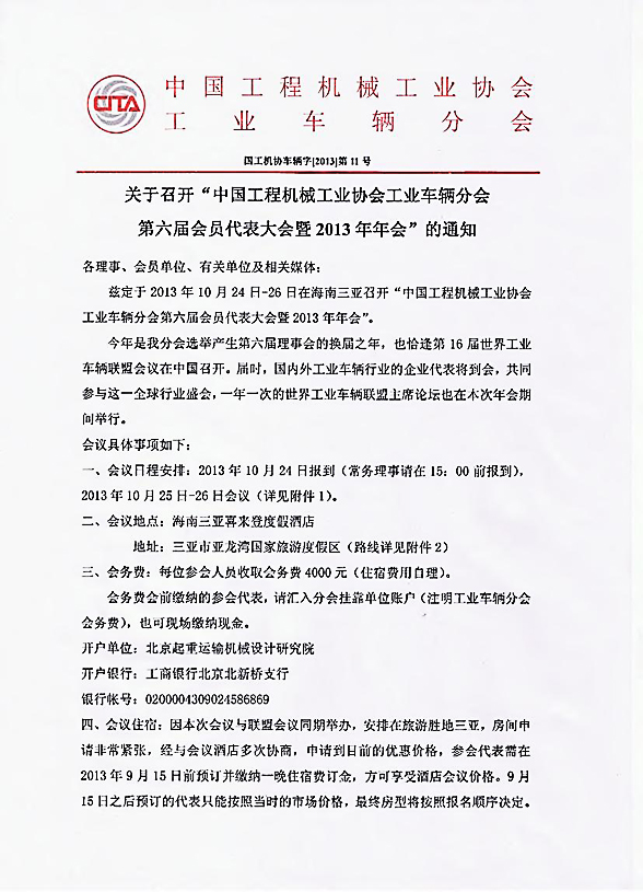 关于召开“中国工程机械工业协会工业车辆分会第六届会员代表大会暨2013年年会”的通知