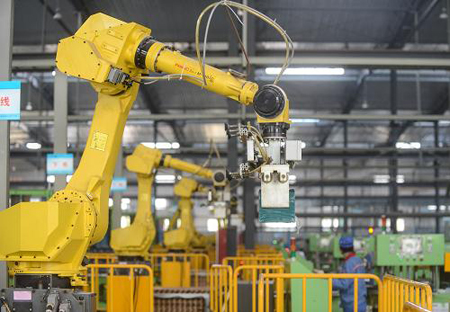 8月28日拍摄的天能循环经济产业园内的全自动蓄电池装配生产线。