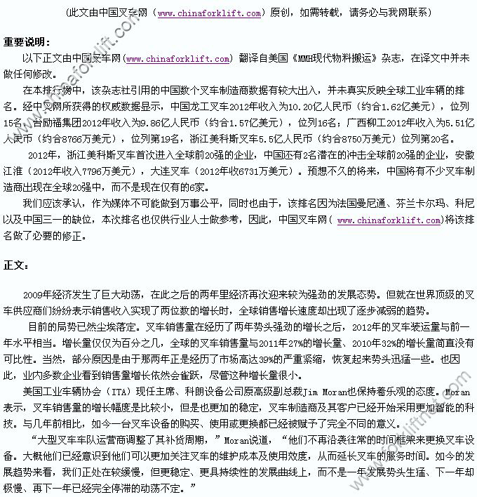 中叉网(www.chinaforklift.com)尊重合法版权,反对侵权盗版。(凡是我网所转载之文章,文中所有文字内容和图片视频之知识产权均系原作者和机构所有。文章内容观点,与本网无关。如有需要删除,敬请来电商榷!)