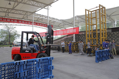今年的叉车工技能竞赛紧张而又激烈,分理论与操作两部分进行,两次均合格的选手颁发中级工职业资格证书,前三名选手颁发高级工职业资格证书。为了考验选手的基本功,在实际操作比赛中增加了很大的难度,选手必须完成2次S型绕障搬运,并将托盘平稳放在指定位置。为了使基本功扎实的选手能脱颖而出,扣分标准更为严格,使得他们高超的技术将这项枯躁的运送工作变成了一场精彩的表演。