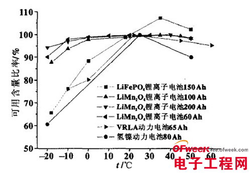 (1)铅酸电池、氢镍电池和磷酸铁锂离子电池的可用容量受温度影响较为显着;