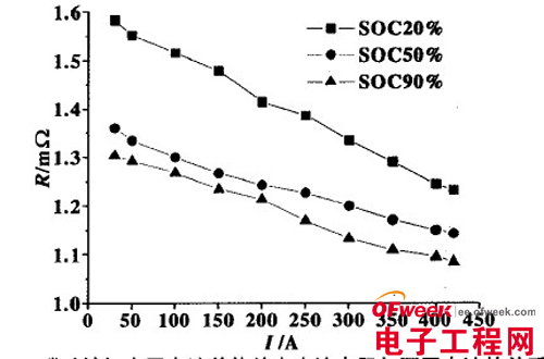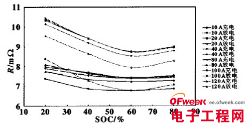 (1)不论充放电倍率大小,SOC对电池内阻的影响都呈现为马鞍形状,鞍底为SOC=60%附近;