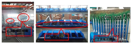 1. 各工位分工明确、物料架增加了标识、工具依次摆放(如图)