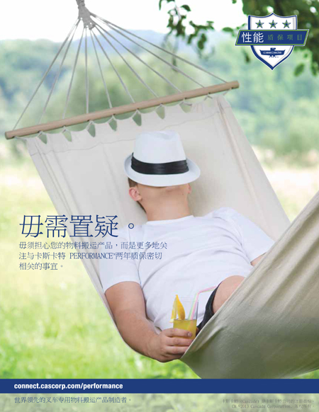 关于卡斯卡特 PERFORMANCE™ 两年质保的详细信息,以及对应的《2013版卡斯卡特(厦门)叉车属具有限公司质量保证政策》,请登录www.cascorp.com.cn查阅,或者联系卡斯卡特销售人员、服务人员或卡斯卡特属具销售商。