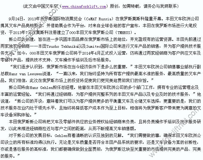 关于丰田自动织机(TICO): TICO是丰田集团的起源公司,成立于1926年,以生产自动织布机开始。产品涉及织布机领域,产业车辆领域,汽车领域,压缩机领域,发动机领域,半导体领域,液晶显示领域和加工中心领域等各行各业。其中,丰田叉车,喷气式织机和压缩机的市场占有率世界第一。丰田集团由丰田自动织机、丰田汽车、丰田通商等13个公司组成。公司的丰田物料搬运事业部全面负责丰田公司产业车辆与物流系统的生产与销售,在日本丰田L&F的标识,在各类产业的物流链中大放异彩。