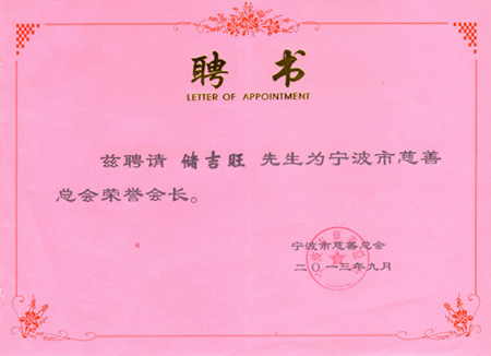 日前,公司董事长储吉旺被市慈善总会授予“宁波市慈善总会荣誉会长”称号,对其长期致力于慈善公益事业的突出贡献给予充分肯定。