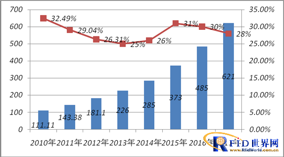 图5 2010-2017年中国RFID行业市场规模(数据来源:国际物促会)