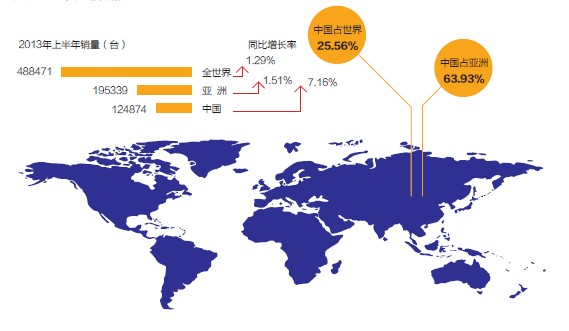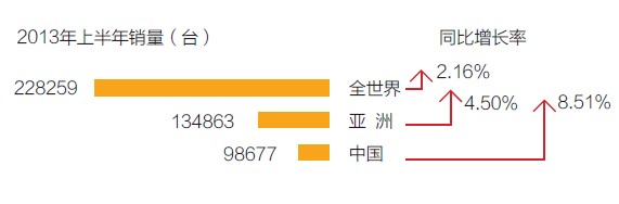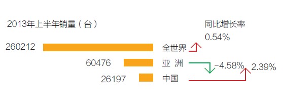 随着国家经济增速的放缓,2011年下半年和2012年全年工业车辆需求量出现逐步下滑的现象,到2013年上半年这种趋势有所好转,国内市场和出口的月销量相比2012年上半年均有提高。整体来看,2013年1-6月,参加分会统计的机动工业车辆制造企业共销售165366台,与2012年同期的152647台相比,上升了8.33%;非机动工业车辆销售量为69万台,几乎与2012年持平。