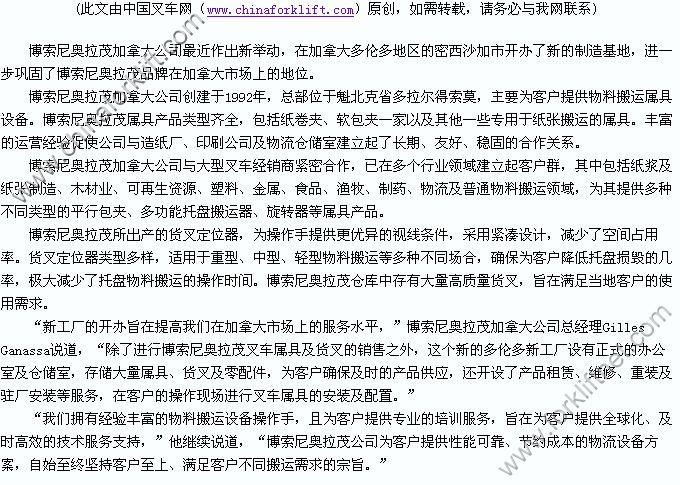博索尼奥拉茂(无锡)叉车属具有限公司是由博索尼香港控股有限公司投资的外商独资公司,占地面积46000平方米,主要从事叉车属具的生产经营及相关售后服务。