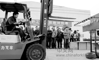 11月13日,凤阳县举行企业叉车工人技能对抗赛,60多名来自该县工业园区玻璃制品企业的叉车工人参加了比赛。