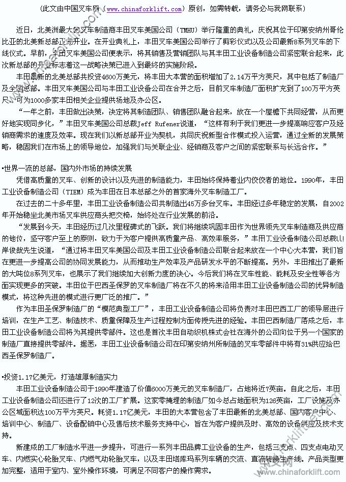 丰田叉车美国公司在美国加州尔湾创建至今已有40多年。自2002年起,丰田已是美国首屈一指的叉车供应商,生产丰田品牌的高质量叉车。在性能卓越的基础上,丰田以优质、可靠、持久而闻名。质量是丰田所有制造公司(包括位于印第安纳州哥伦布的丰田工业设备制造公司(TIEM))所采用的丰田生产体系的标志,该体系全球闻名。大部分在美销售的叉车——包括8系列都是丰田工业设备制造公司制造的。