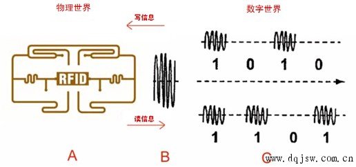 图 1表示了一种典型的RFID读写方案。RFID标签是一种智能设备,装有电子芯片和智能天线。RFID读写器与标签交换数据,然后把信息发送到PLC或者PC做进一步处理。