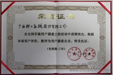 2013年12月5日,厦门 — 由中国质量协会、全国用户委员会在厦门召开的2013年全国实施用户满意工程推进大会上,广西柳工机械股份公司获得“2013年复评全国实施用户满意工程先进单位”荣誉称号。