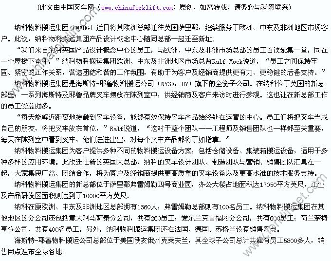 关于海斯特: 海斯特诞生于1929年,在80多年的发展过程中凭借坚固耐用的品质赢得广泛声誉,并被独立媒体评为“总拥有成本最低”的叉车品牌,海斯特母公司纳科物料搬运集团(NMHG)是全球最大的叉车制造商之一,总部设在美国克里佛兰,同时拥有海斯特(HYSTER®)、耶鲁(YALE®)、UTILEV®三大叉车品牌,目前全球雇员超过5800人,全球叉车保有量超过80万台,年营业额超过25亿美元。
