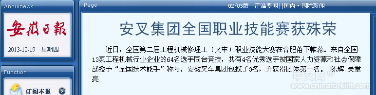 近日,全国第二届工程机械修理工(叉车)职业技能大赛在合肥落下帷幕。来自全国13家工程机械行业企业的64名选手同台竞技,共有4名优秀选手被国家人力资源和社会保障部授予“全国技术能手”称号,安徽叉车集团包揽了3名,并获得团体第一名。(合力 陈辉)