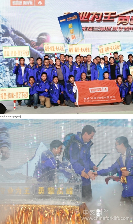12月9日在广州希尔顿酒店召开了喜威中国珠三角区域销售大会。一大早,各区域的同事们便纷纷来到会场,在雪山上插上签了自己名字的旗子,在3D留影区留下自己的靓影。开场的启动仪式,我们的CEO Fulco先生以一种耀眼的方式出场让人印象深刻:只见他身穿专业登山装备,舞蹈员跳着舞将其请上舞台,几个有力的POSE,让全场欢呼声连连不绝!接着区域副总裁陈浩霖先生和巩固先生也纷纷上台,同CEO一起为我们劈开了真冰制成的冰山,开启了2014年的销售之路!