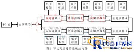 系统由一台中央监控设备(主阅读器)和一系列远程终端设备(从阅读器)构成了点对多点的多任务无线通信系统。主阅读器与从阅读器,以及各从阅读器之间通过双绞线进行连接, 从阅读器可以作为一个数据中转站,起到暂存数据和距离延伸的作用,各个中转站之间以单向通信方式进行数据传递。各从阅读器由主阅读器通过双绞线进行远程供电,简化了系统结构,降低了成本。为了保证数据传输和系统供电的可靠性,各从阅读器之间组成了一个复用段环状结构,这种结构较链状结构的可靠性有大幅度的提高。