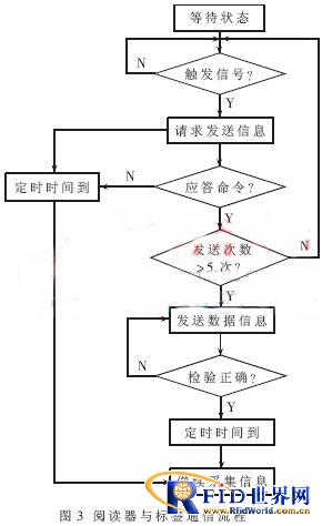 电子标签携带着相关信息,当微控制器接收到触发信号后,标签被激活,向阅读器发出呼叫请求,在定时器规定的时间内,不断地向距离最近的阅读器发送数据发送请求命令,直到收到阅读器发出的应答命令。在标签收到应答命令后,将携带的消息发送出去,判断阅读器的反馈信息,如果反馈信息与校验码相符,表示阅读器正确收到标签的数据。阅读器与标签的通信过程如图3所示。
