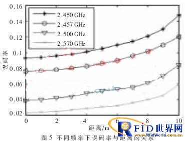 由图5可知,在某一固定频率下,数据传输的误码率随着阅读器和标签之间距离的增大而逐渐升高;在相同距离下,当NRF2401的中心频率选择在2 450 MHz附近时,误码率较高,在偏离2 450 MHz时,误码率较低。另外,为了降低误码率保证数据的传输效率,中心频率点的尾数要尽可能的精确,这样可以大大降低数据传输的误码率。这主要是在ISM频段,WLAN、Bluetooth、Zigbee等设备的工作频率都集中在2 450 MHz附近,相互之间会产生严重的干扰。因此,设备在实际应用时,需要首先测试该环境下的空间电磁频谱分布情况,采用合适的中心频率尽量避免外界的电磁干扰,以提高系统的数据传输效率。