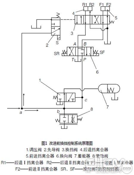 改进前该型叉车液力变速器换挡控制系统主要由调压阀1、先导阀2、换挡阀3、后退挡离合器4、前进挡离合器5、换向阀6、蓄能器7和微动阀8等组成,如图1所示。