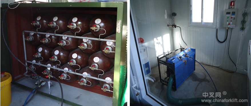 利用厂区内部的管道天然气气源,联接上天然气压缩机,再增加一组压储气钢瓶就可以建成一个厂区专用的小型CNG加气站,从而给CNG叉车加气。因为管道天然气具备的气源稳定性高、价格便宜,因此,使用该方案可以极大程度的降低用户的使用成本,和降低柴油荒带来的负面影响。
