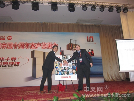 “万年青”发表之后,随即开始的是“十年感恩•客户案例集”华东地区揭幕仪式,来自太古饮料集团的物流总监瑞杰森先生和丰田叉车营业部松本本部长一同为案例集进行了揭幕。作为丰田叉车中国十周年特别策划之一,该案例集是由丰田叉车与全国十家客户共同精心打造,分为“高效作业篇”、“耐久篇”和“使用成本优化篇”三册,记录了来自各行业的丰田客户与丰田携手、共同成长的历程。丰田通过此案例集的制作,除了想将这些成功案例与更多客户分享之外,更想以此向十年来与丰田风雨同行的中国客户感恩致意。
