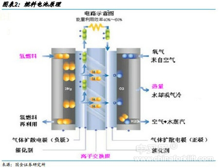 燃料电池具备发电站的功能,且效率高,无污染:发电时,燃料和氧化剂由电池外部分别供给电池的阳极和阴极,阳极发生燃料的氧化反应,阴极发生氧化剂的还原反应,电解质将两个电极隔开,导电离子在电解质内移动。不同于普通的电池,只要能保证燃料和氧化剂的供给,燃料电池就可以连续不断的产生电能。燃料电池的理想转化效率为83%,目前实际转换效率在45%-60%,而火力发电和核电的效率大约在30%-40%。燃料电池生成物主要是水,基本上不排放有害气体,是一种非常清洁的能源。