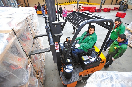 近日,宁波如意公司自主研发成功一种可前后左右随意行驶的电动重式叉车。这种车辆不仅使货物运输更加方便,还节省了仓储管道的空间。