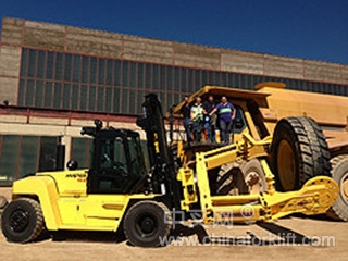 该款海斯特轮胎搬运叉车是海斯特公司最新推出的产品,众所周知,采矿设备一般都巨大无比,如何安全快速换胎一直困扰着许多设备负责人。此次海斯特设计的轮胎搬运叉车配备专用夹具,解决了安全快速换胎的难题。此款新产品除了用于修理和更换大型轮胎外,也可用于搬运一些重型的采矿设备零部件,如引擎,变速箱及轴承等。海斯特大叉车,有着特别持久的动力传动系统,引擎和传输保护系统也确保了操作的可靠性。海斯特全系列的大叉车系列,已被世界各地的大型矿业公司广泛采用。