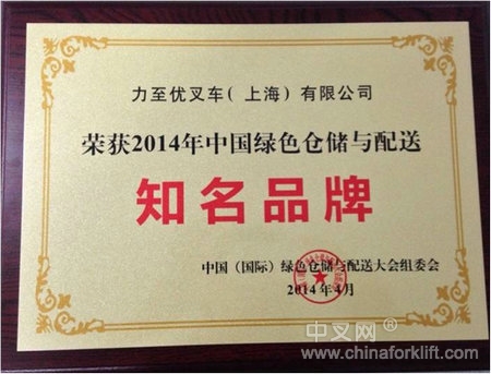 2014年在江苏省南京市召开的2014中国(国际)绿色仓储与配送大会上,力至优再次被评为“绿色和配送知名品牌“,这是同行业内首家叉车企业获得这一殊荣。力至优秉承一贯坚持的环保理念,努力推动中国物流行业绿色产业发展,做物流行业绿色产品的领跑者。