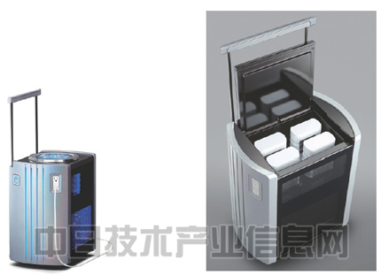 在东京车展上展示了作为可搬运发电机使用的燃料电池系统“FCDock”(左)。在燃料瓶中填充水合肼,安装到系统上使用(右)