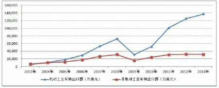 在出口方面,随着我国工业车辆行业竞争力的不断提高,我国工业车辆出口也呈现快速增长态势。在经历2009年金融危机导致的下滑后,2010年出口恢复快速增长,2011年继续保持增长,并创当期历史新高。2012年我国工业车辆共出口1,783,947台,同比下降了4.62%;出口金额156,940.76万美元,同比上升了18.76%。2013年我国工业车辆共出口1,792,298台,同比上升了0.47%;出口金额168,361.31万美元,同比上升了7.28%。
