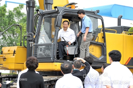 “我们开发的CLG970E挖掘机是目前我公司最大吨位的挖掘机产品,兴许彭书记下次来就能看到更大吨位的挖掘机产品了。”曾光安兴奋地向彭清华书记介绍。“柳工不仅仅是工程机械行业的领军企业,更是我们广西工程机械的荣耀。”彭清华由衷地说。