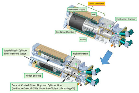 W形活塞的设计是FPEG的关键之处。在气缸的底座中,有一个固定的圆柱支柱。中空的活塞就是依附在这个固定的支柱上进行往复运动,固定支柱内部设计了冷却油的管道。为了保证活塞在润滑条件不足的情况下也能正常地进行往复运动,在活塞和气缸衬垫上都使用了陶瓷涂层降低摩擦力。而依附于活塞的磁铁的位置被设在远离燃烧室的一端,避免受到高温的影响而出现消磁现象。