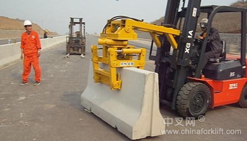 该款设备由厦工E系列叉车改装而来,可实现360度无障碍安装高速路隔离防护水泥墩作业,改变以往依靠吊车或人工作业模式,作业效率高,成本低。
