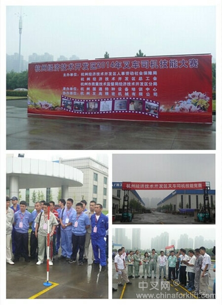 2014年6月21日上午,“杭州经济技术开发区叉车司机技能大赛”在杭州友高精密机械有限公司举行。比赛分成理论考试与叉车比武两部分。参赛选手是来自各个公司的员工。别看他们不起眼,一旦上了叉车,个个都是叱诧风云、能征善战的高手!比赛当天,下起了大雨。选手们不畏风雨在“地弯通道行驶”“绕曲线垒高作业”这两个比赛项目中奋力拼搏。他们精湛的叉车技能,赢得了现场观众一阵阵热烈的掌声和欢呼声!