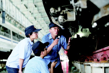 青岛动车段车辆检修人员检修动车车底。 通讯员 吴化鹏 摄